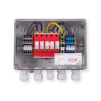 Kompakte und vorkonfektionierte Box mit Typ II Überspannungsableiter für die DC Seite. Geeignet für WR mit nur 1 MPP bis 1100 V DC Spannung. Diese Überspannungsbox hat je MPPT 2 Eingangsklemmen mit Federzugkontakten pro Pol und Ableiter. Hier werden keine Aderendhülsen benötigt. Dadurch ist die Kontaktfläche noch größer und der Übergangswiderstand gering. Auch die Abgangsklemme ist schraublos.