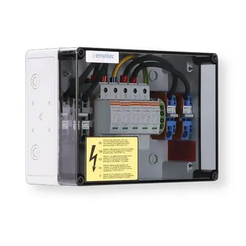 Der enwitec Überspannungsschutz DC Typ I+II für 2 MPPT Systeme bietet zuverlässigen Schutz für Photovoltaikanlagen vor Überspannungsschäden, die durch Blitzschlag oder Netzstörungen entstehen können.
