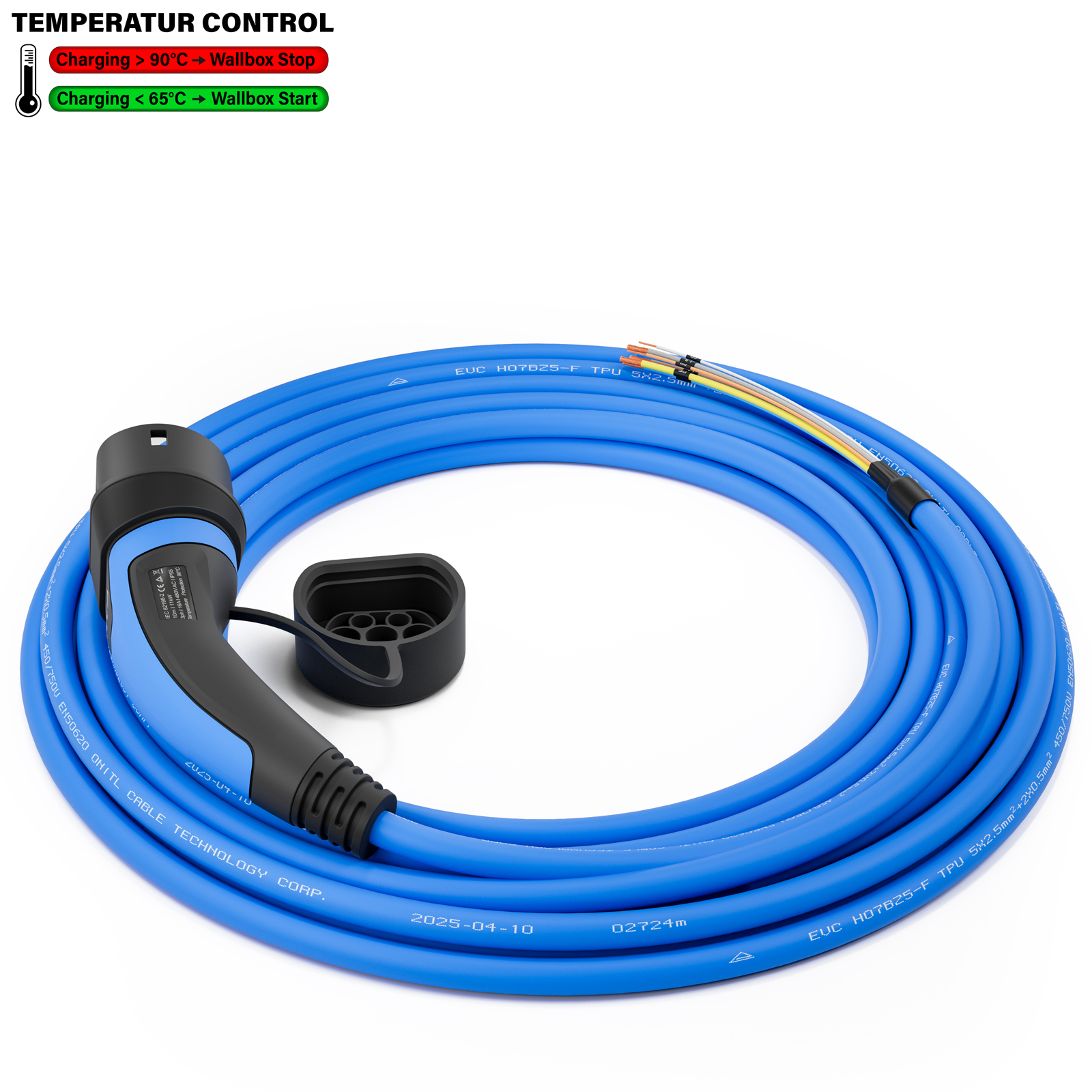 Ladekabel Typ 2 Mode 3 | 11kW | 10m | 16A | Offenes Ende (freie Kabelenden) für Wallbox Installation | Integrierte Temperaturüberwachung | Blau