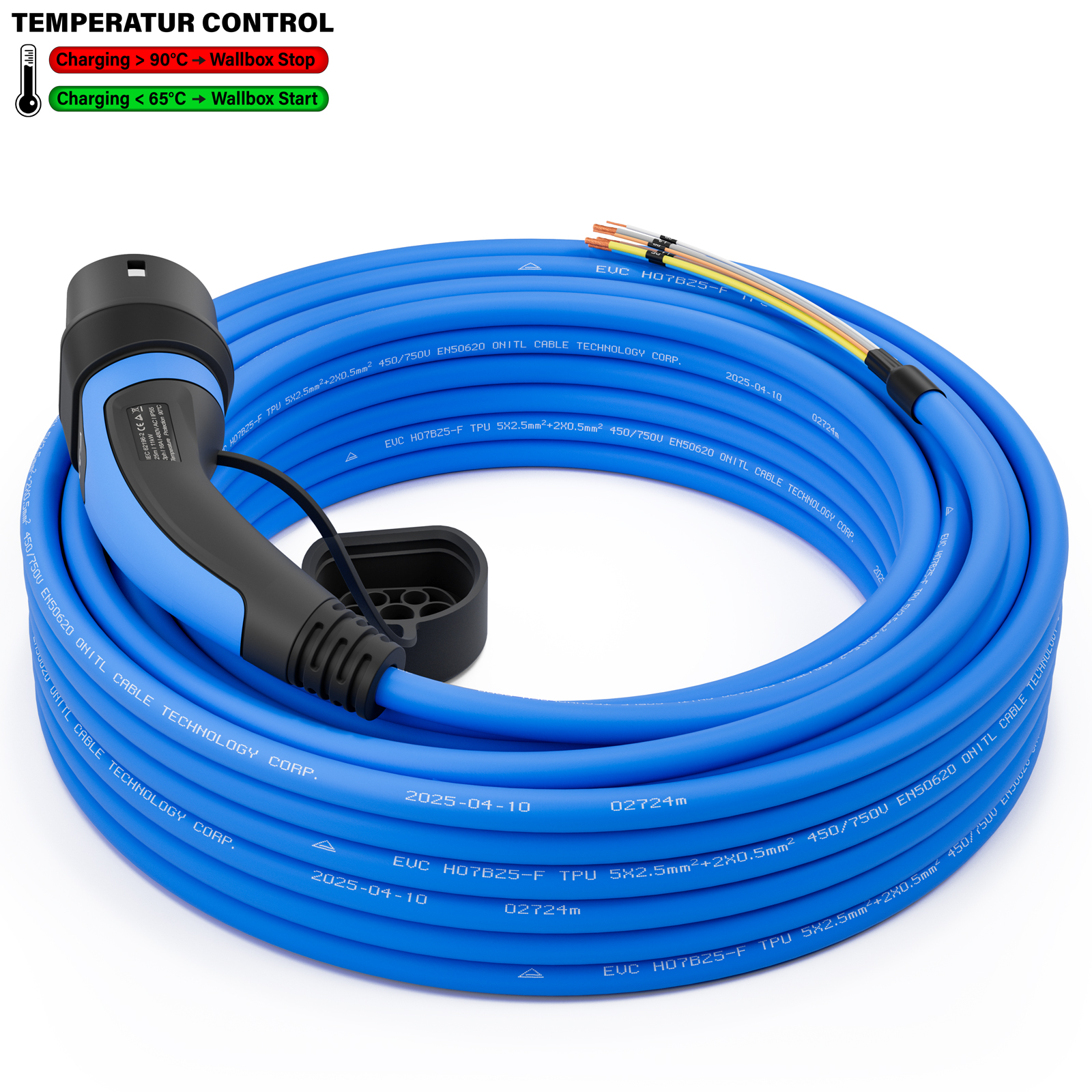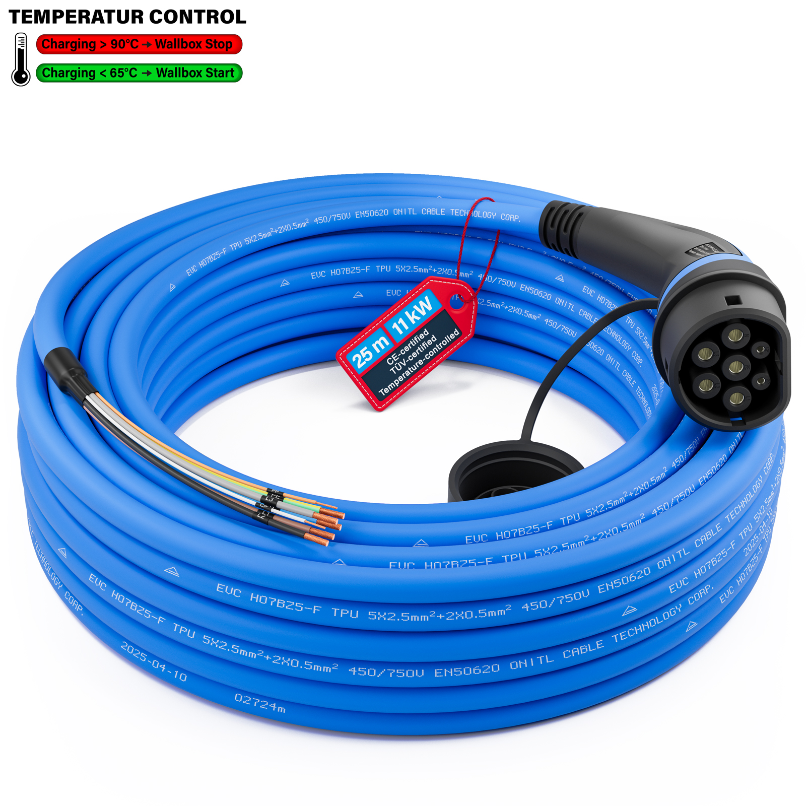 Ladekabel Typ 2 Mode 3 | 11kW | 25m | 16A | Offenes Ende (freie Kabelenden) für Wallbox Installation | Integrierte Temperaturüberwachung | Blau