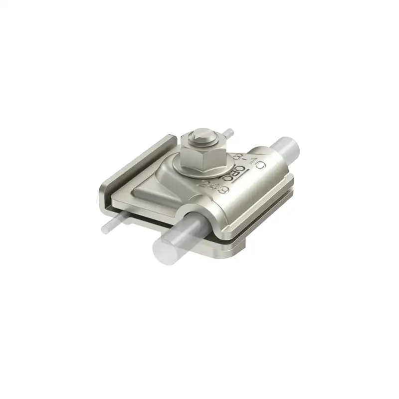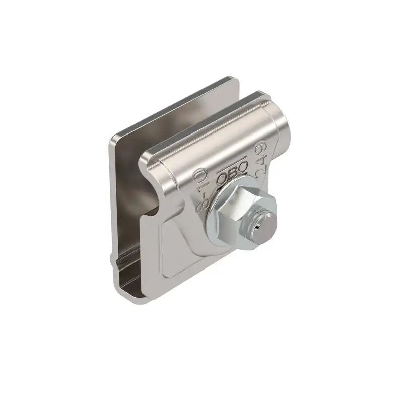 Universal-Erdungsklemme im vormontierten Zustand zum Einbinden von PV-Montagesystemen in den Potentialausgleich.
