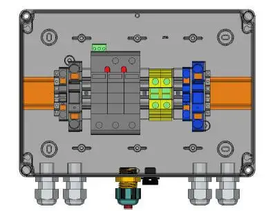 Kompakte und vorkonfektionierte Box mit Typ II Überspannungsableiter für die DC Seite. Geeignet für WR mit 2 MPP bis 1000 V DC Spannung. Wartungsfreundliche steckbare Ableiterelemente mit mechanischer Funktionsanzeige. Anschluss der DC Leitungen mit Anschlussklemmen.