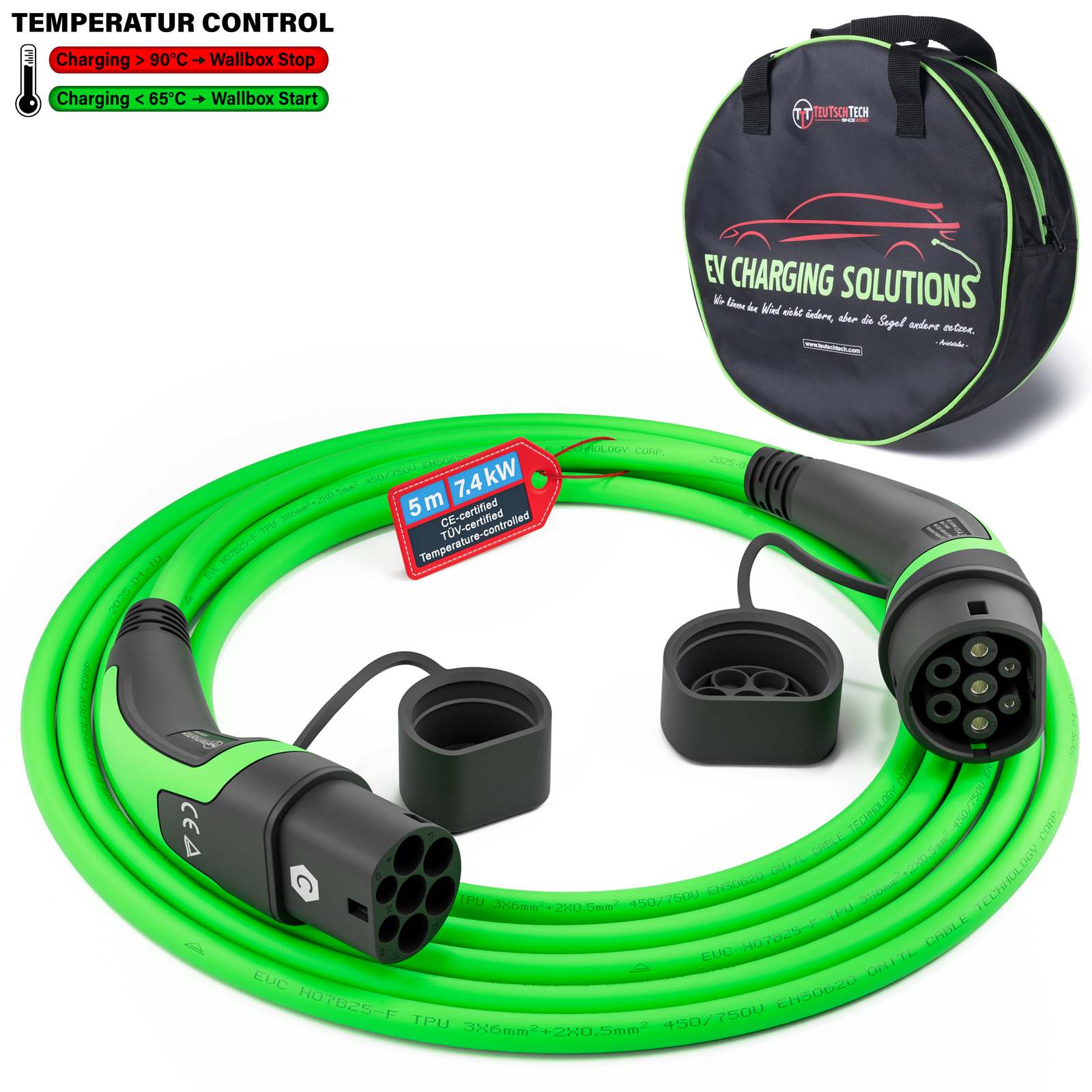 Typ 2 Ladekabel Mode 3 | 32 A | 7,4 kW | 5 m | Temperaturüberwacht | Sicher Laden | Grün