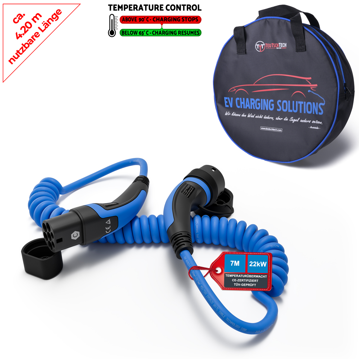 Das TEUTSCHTECH Spiral-Ladekabel Typ 2 32A vereint modernste Sicherheitstechnologie, erstklassige Materialien und maximale Ladeleistung in einem einzigen, innovativen Produkt. Entwickelt für E-Mobilisten, die beim Laden keine Kompromisse eingehen – weder bei der Leistung noch bei der Sicherheit.